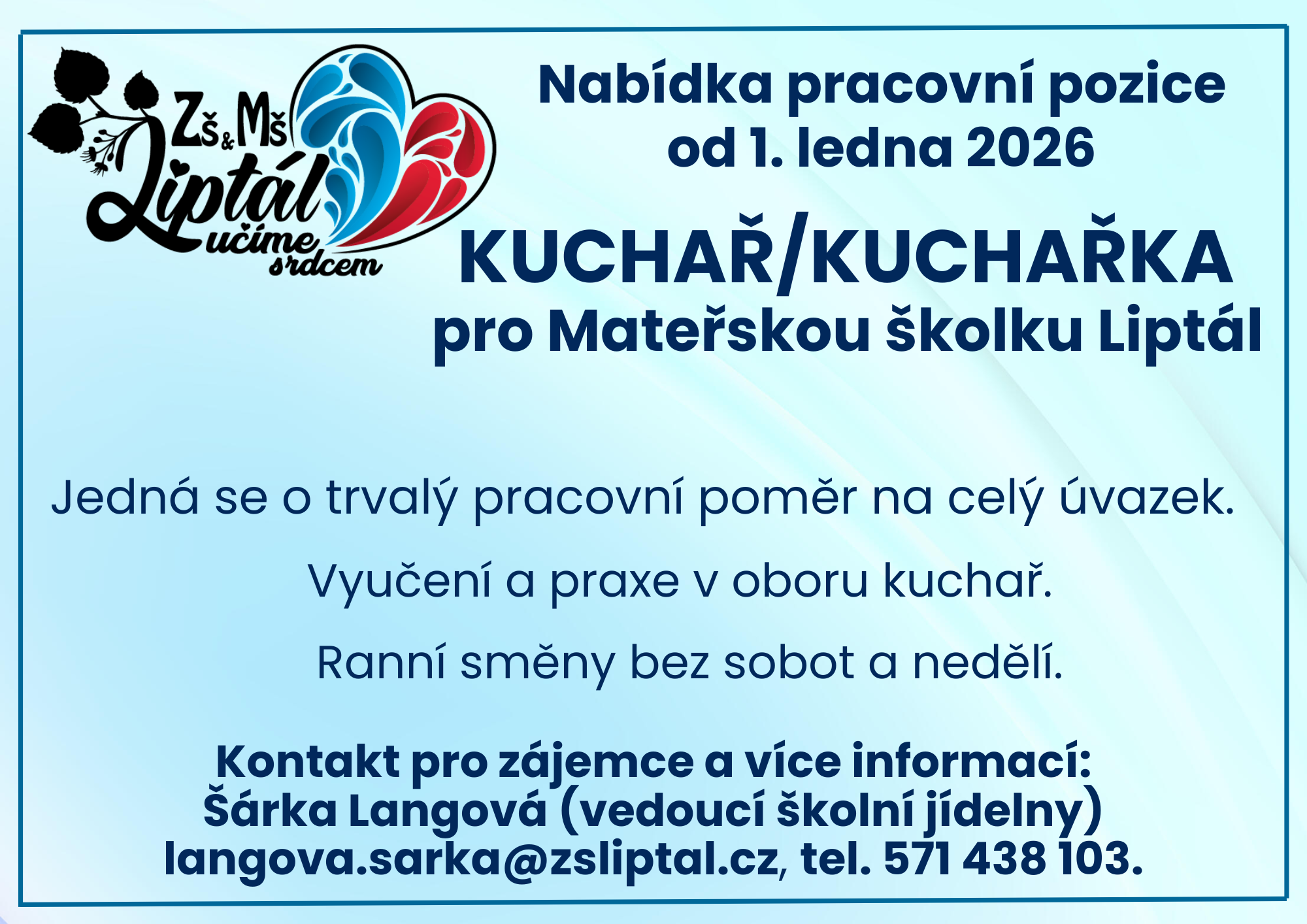 Nabídka pracovní pozice od 1.1.2026 KUCHAŘ/KUCHAŘKA pro Mateřskou školku při ZŠ Liptál. Jedná se o trvalý pracovní poměr na celý úvazek. Ranní směny bez sobot a nedělí. Vyučení a praxe v oboru kuchař. Kontak pro zájemce a více informací: Šárka Langová (vedoucí školní jídelny), langova…