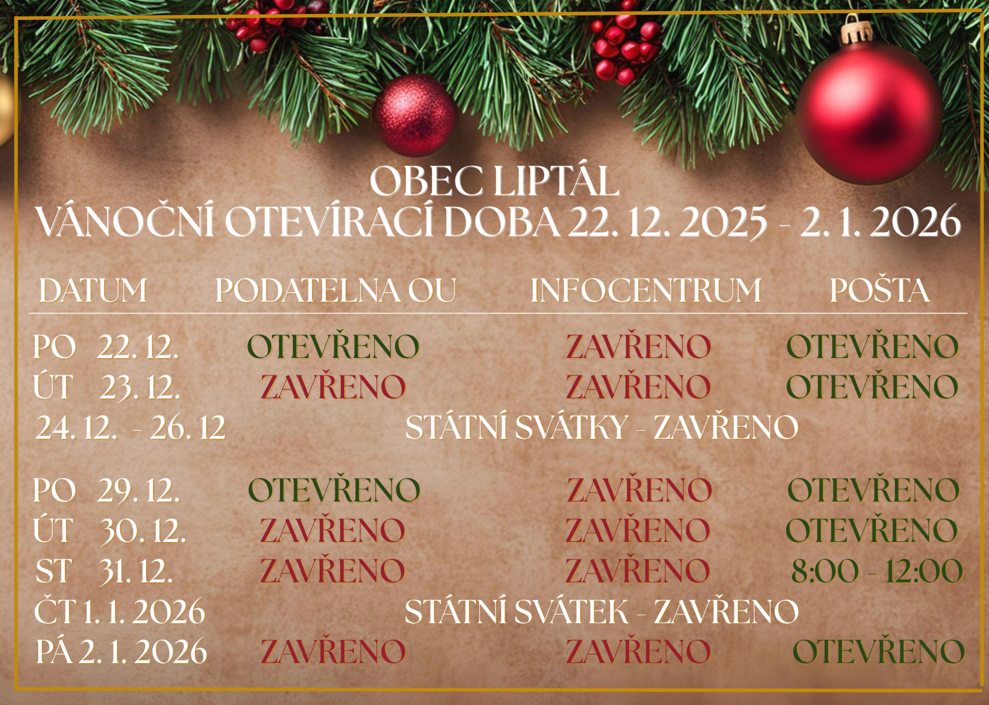 Vánoční otevírací doba OU Liptál 2025 Datum Podatelna OU Infocentrum Pošta PO 22.12. OTEVŘENO ZAVŘENO OTEVŘENO ÚT 23.12. ZAVŘENO ZAVŘENO OTEVŘENO ST 24.12. STÁTNÍ SVÁTEK ČT 25.12. …