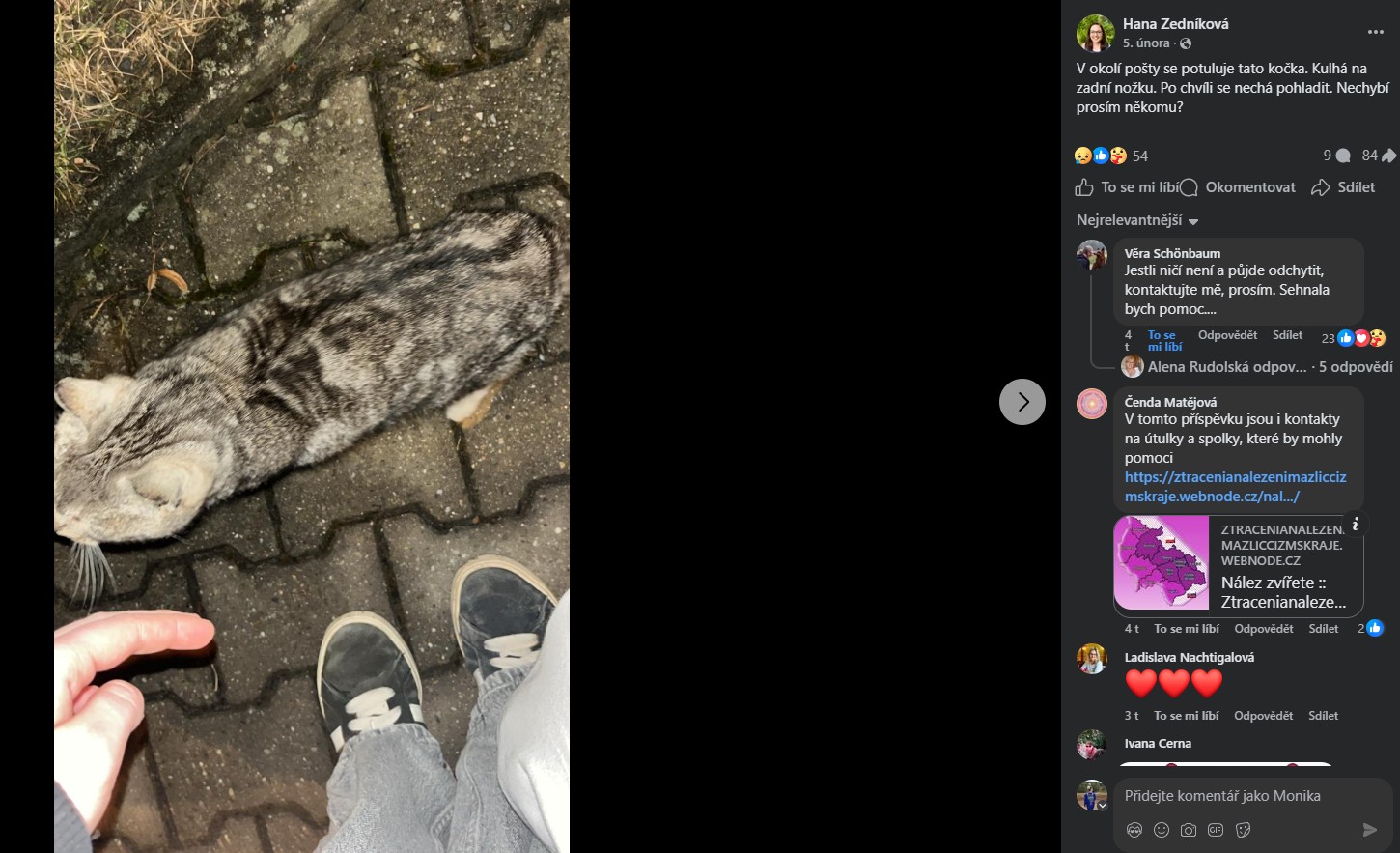 Dne 9.3.2026 byla nalezena kočka v okolí pošty na adrese Liptál č. 81 Nález byl několikrát hlášen na Facebooku ve skupině Liptál dnes a zítra a to dne 5.2.2026 a 8.3.2026. Kočka byla hlášena se zraněním zadní tlapy. Kontaktovala jsem spolek Dobré ruce z.s. ve Zlíně, který byl ochotný ji…