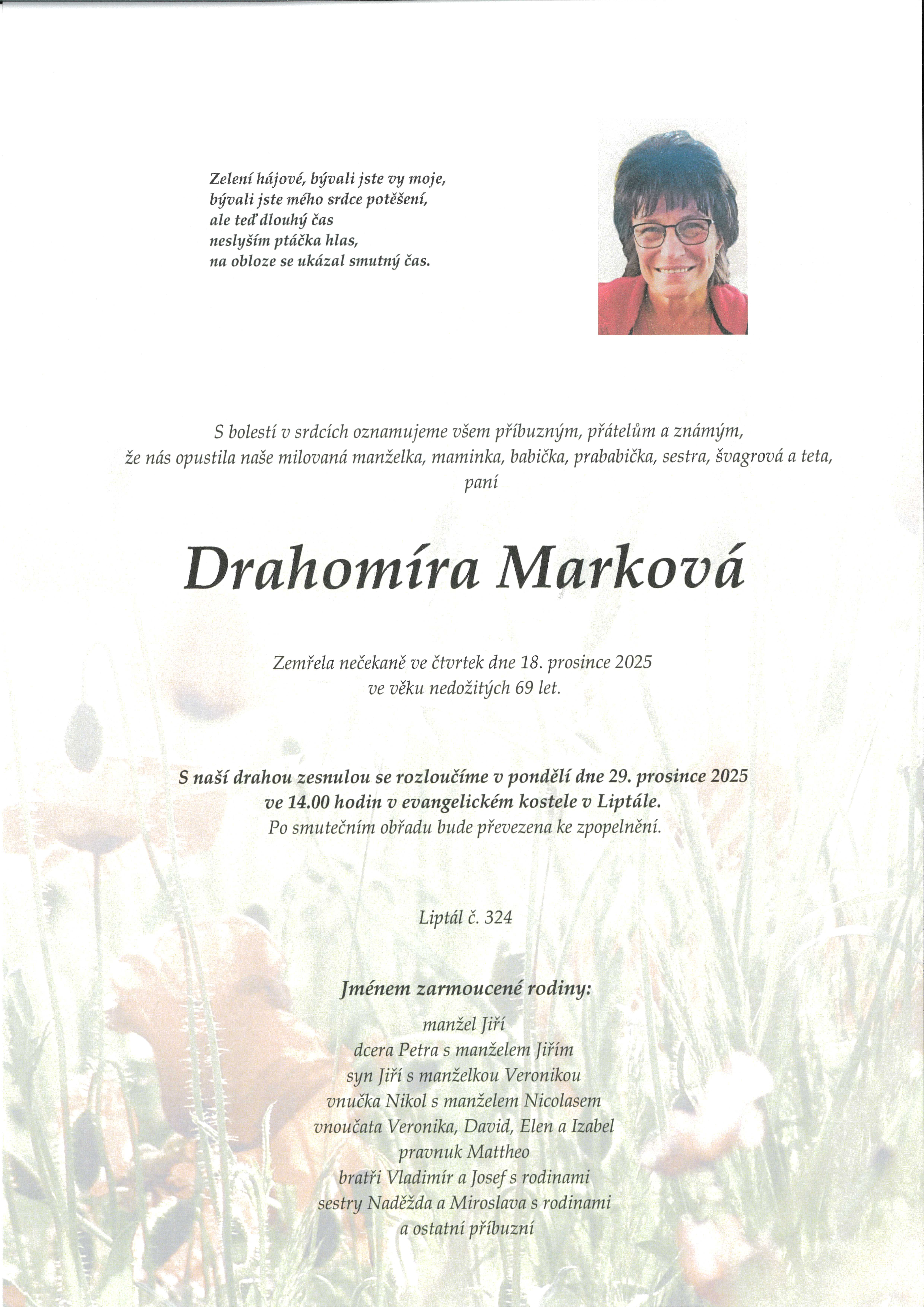 Úmrtí Drahomíra Marková, Liptál 324, zemřela 18.12.2025 ve věku nedožitých 69 let, pohřeb 29.12.2025 ve 14h v ČCE Drahomíra Marková, Liptál 324, zemřela 18.12.2025, pohřeb 29.12.2025 ve 14h v ČCE |
