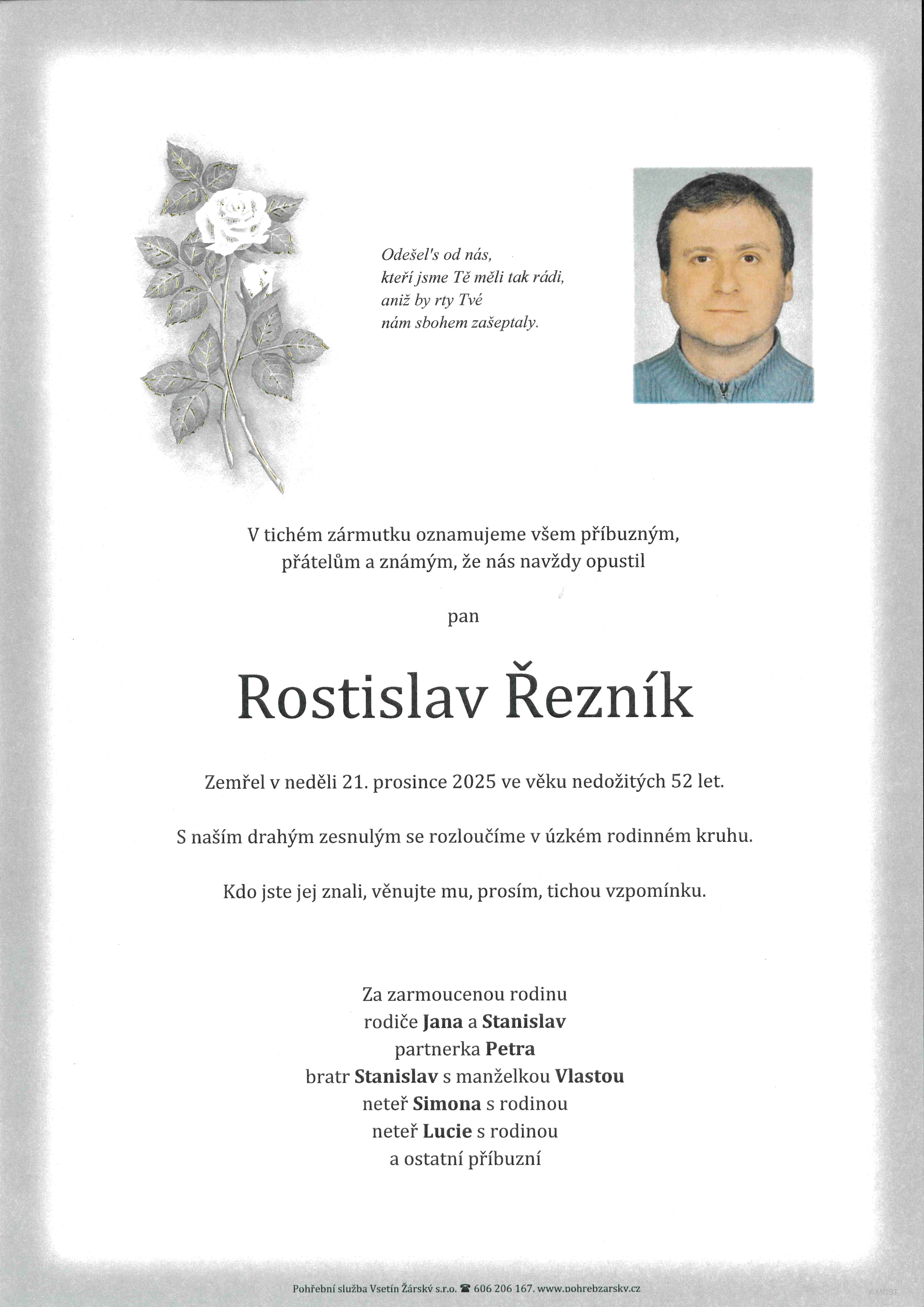 Úmrtí Rostislav Řezník, Liptál 287, úmrtí 21.12.2025, rozloučení v úzkém rodinném kruhu. Rostislav Řezník, Liptál 287, zemřel 21.12.2025, rozloučení v kruhu rodiny |