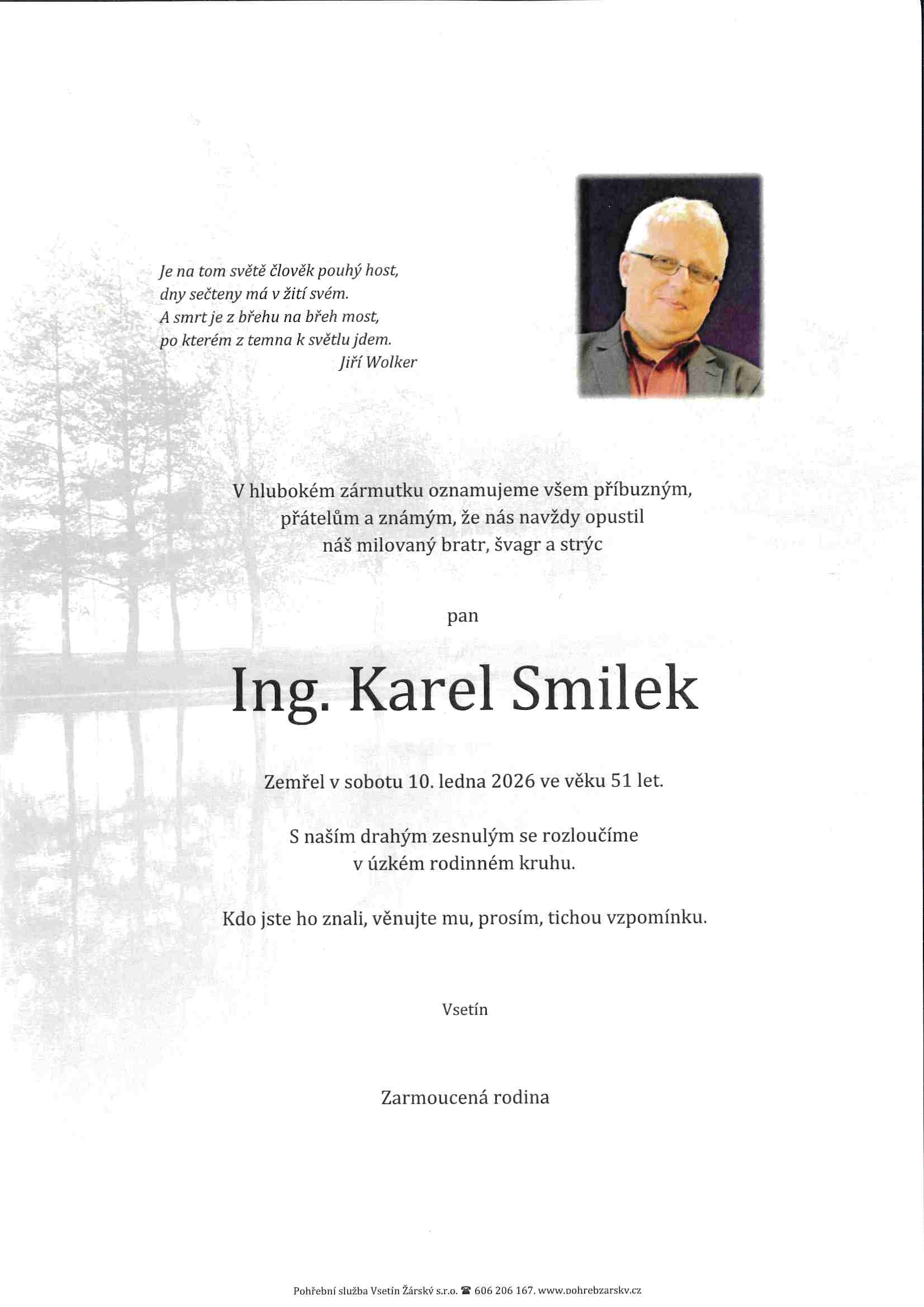 Úmrtí Ing. Karel Smilek, 51 let, dříve Liptál 413, zemřel 10.1.2026, rozloučení v úzkém rodinném kruhu. Ing. Karel Smilek,51 let, dříve Liptál 413, zemřel 10.1.2026, rozloučení v rodinném kruhu |