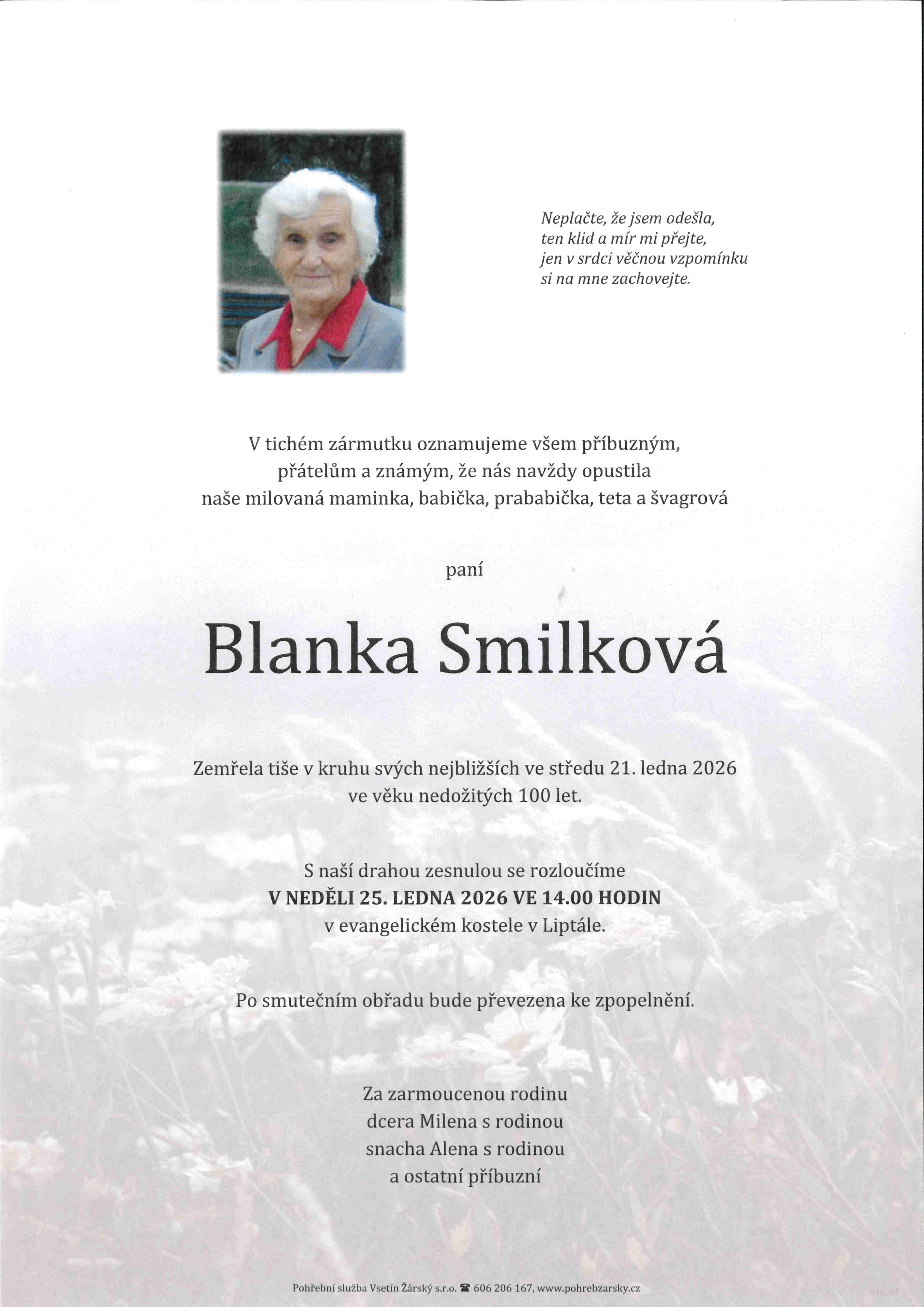 Úmrtí Blanka Smilková, Liptál 380, ve věku 99 let, zemřela 21.1.2026, pohřeb 25.1.2026 v ČCE Blanka Smilková, Liptál 380, ve věku 99 let, zemřela 21.1.2026, pohřeb 25.1.2026 v ČCE |