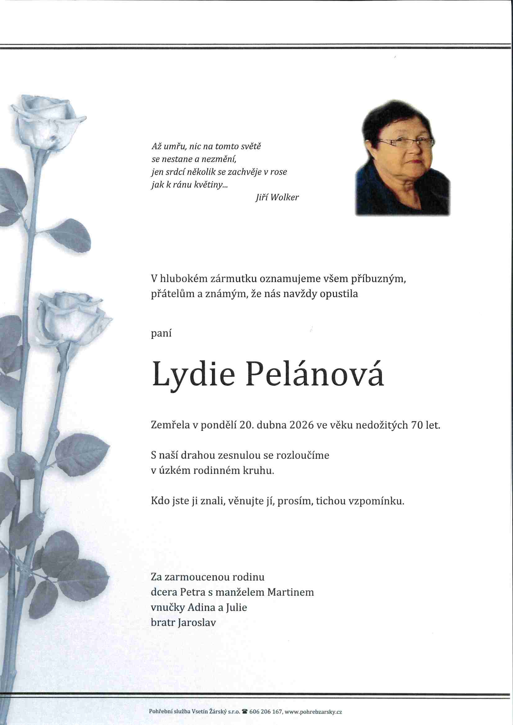 Úmrtí Lydie Pelánová, Liptál 119, zemřela 20.4.2026 ve věku nedožitých 70 let. Pohřeb v úzkém rodinném kruhu. Lydie Pelánová, Liptál 119, zemřela 20.4.2026 ve věku nedožitých 70 let. Pohřeb v úzkém rodinném kruhu. |