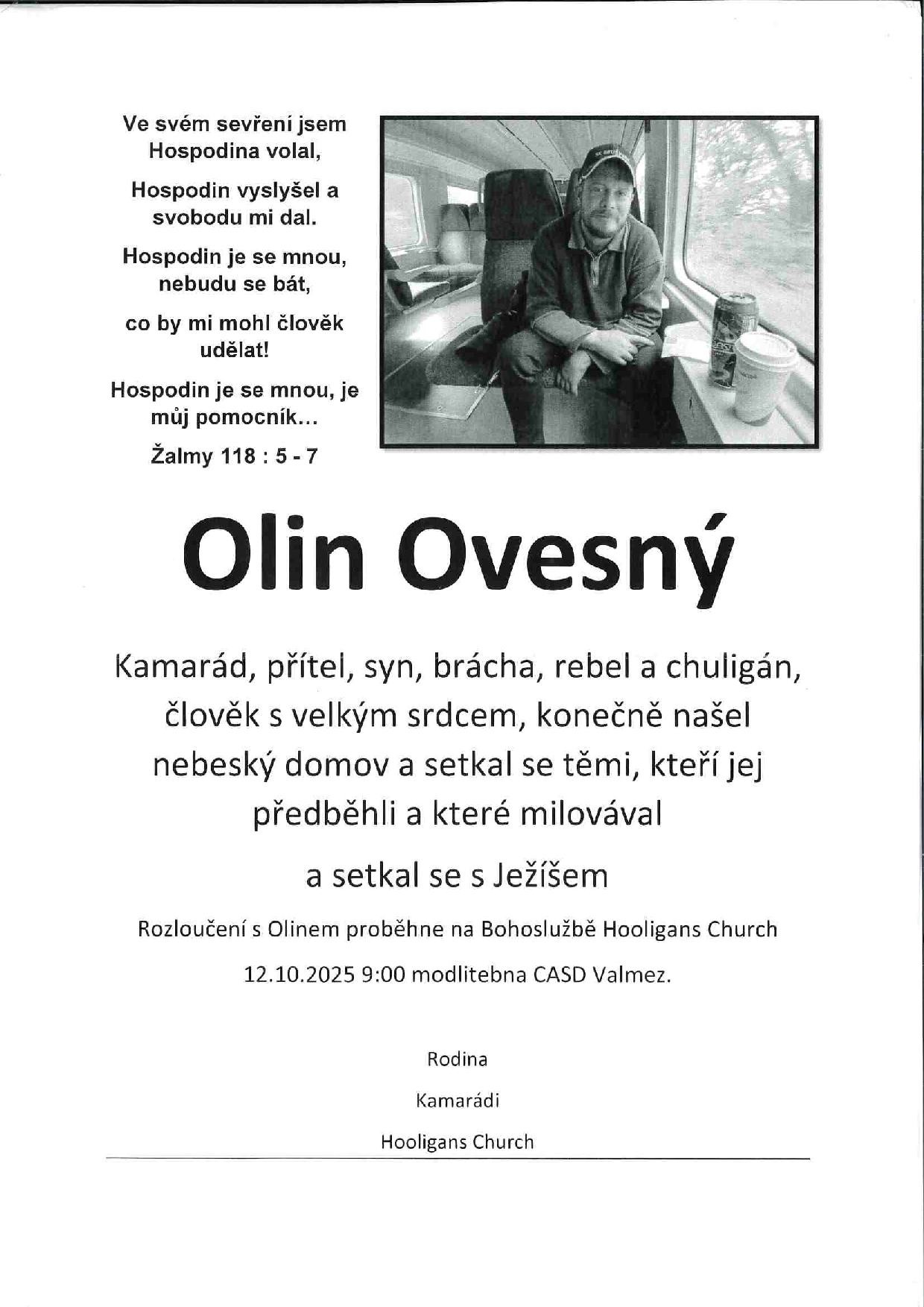 Oldřich Ovesný, vedený č.p. 331, zemřel 2.10.2025 ve věku 40 let ve Valašském Meziříčí, rozloučení 12.10.2025