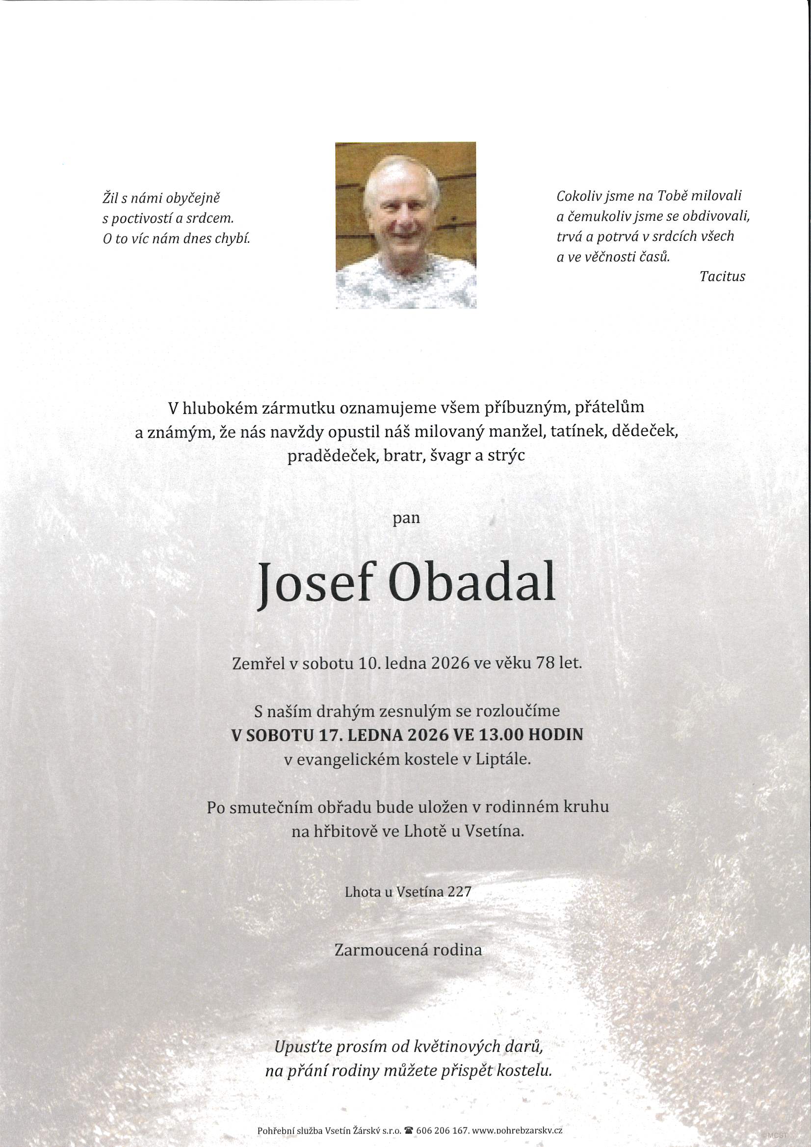 Úmrtí Josef Obadal, Lhota u Vsetína 227 (dříve Liptál, Sadová), zemřel 10.1.2026, pohřeb 17.1.2026 ve 13h ČCE Liptál Josef Obadal, Lhota u Vsetína 227 (dříve Sadová), zemřel 10.1.2026, pohřeb 17.1.2026 ve 13h ČCE |