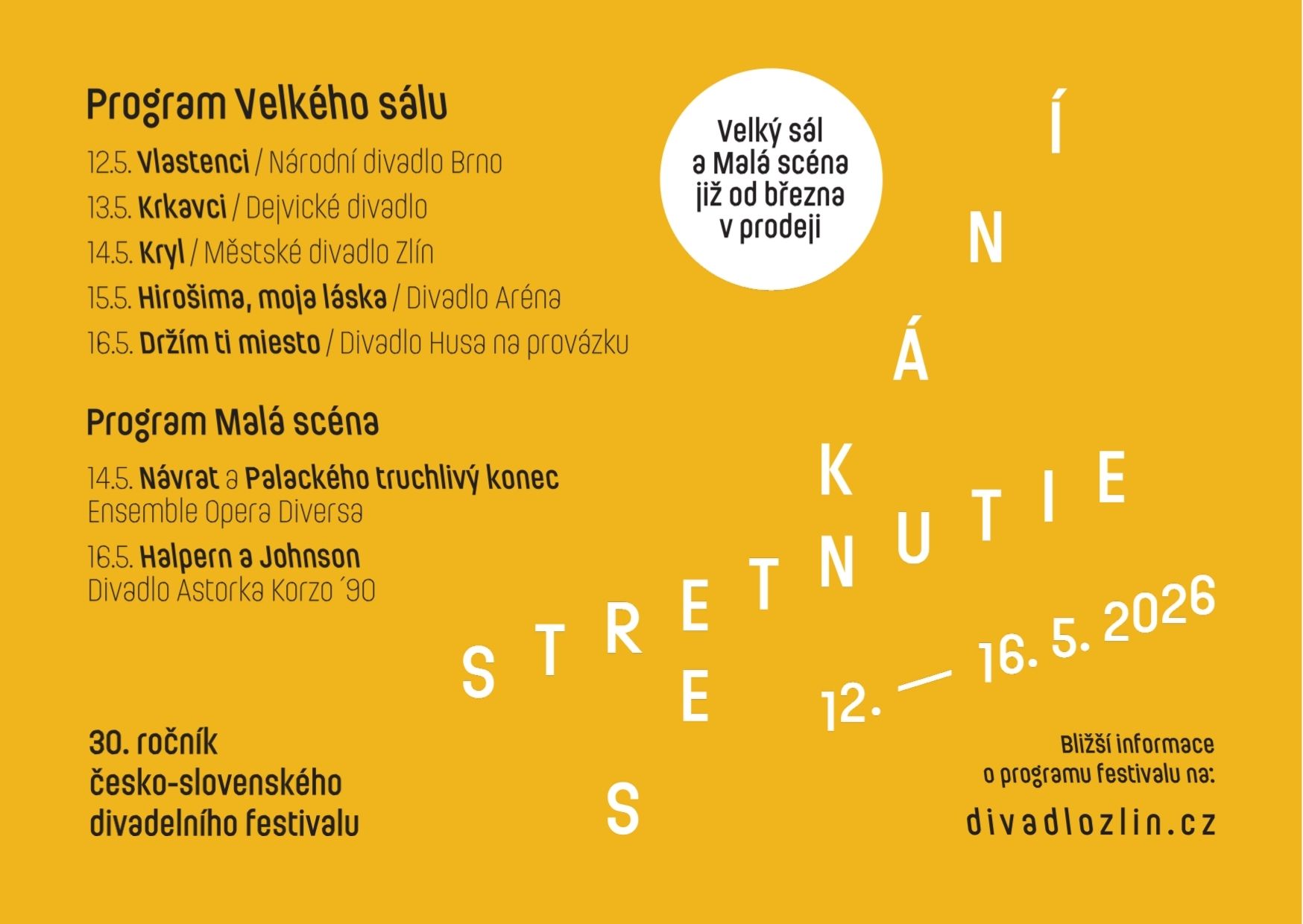 Už v pondělí 2. března zahajujeme předprodej vstupenek na jubilejní 30. ročník divadelního festivalu Setkání Stretnutie 2026.
