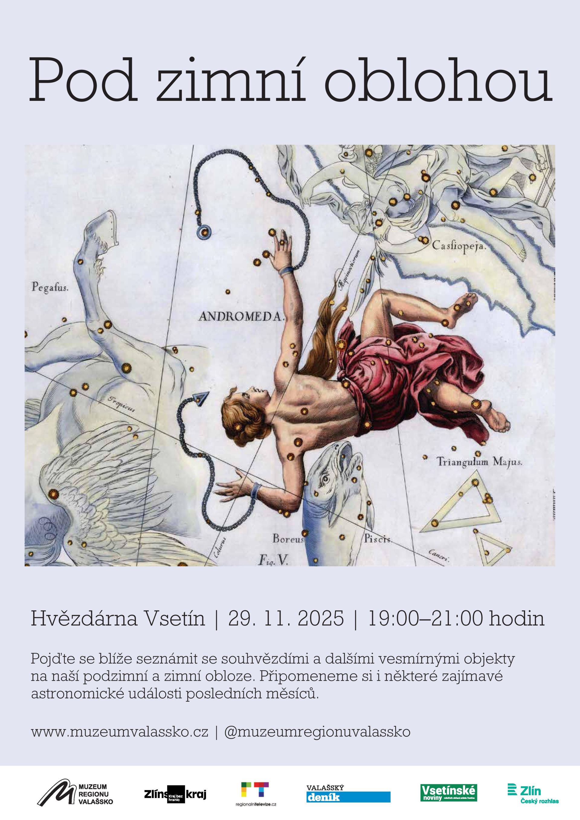 Nenechte si ujít další pokračování z cyklu setkání na Hvězdárně Vsetín, při kterém se návštěvníci seznamují se souhvězdími a zajímavými objekty, typickými pro aktuální roční období. Program s názvem Pod zimní oblohou proběhne v sobotu 29. listopadu od 19 do 21 hodin. Čeká Vás zajímavé povídání a pozorování dalekohledy. Více na https://www.muzeumvalassko.cz/akce-a-vystavy/pod-zimni-oblohou-1