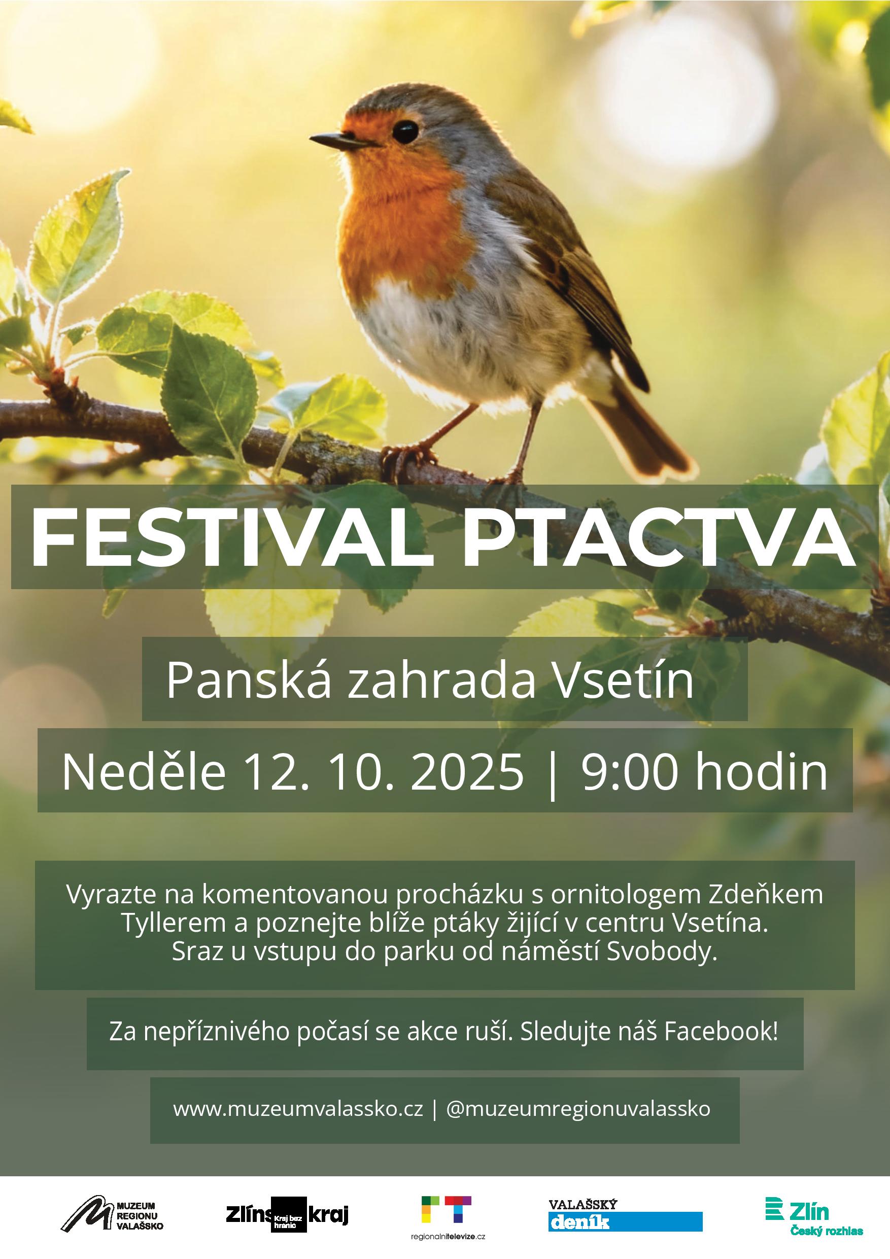 Zajímavé i zábavné poznání života opeřenců v centru města nabídne komentovaná vycházka Festival ptactva, na kterou se můžete vypravit v neděli 12. října do Vsetína. Sraz účastníků je v 9:00 hodin u vstupu do Panské zahrady ze strany od náměstí Svobody. Během společné procházky se dozvíte spoustu zajímavostí z oblasti ornitologie a ekologie. Zoolog Zdeněk Tyller Vám ukáže i odchyt ptáků a vysvětlí, proč se vlastně ptáci kroužkují. Za trvalého silného deště se akce nekoná. Pokud si nebudete jisti, volejte na tel. 775 284 222 (Zdeněk Tyller). Vstup zdarma. Více na https://www.muzeumvalassko.cz/akce-a-vystavy/festival-ptactva-panska-zahrada-vsetin